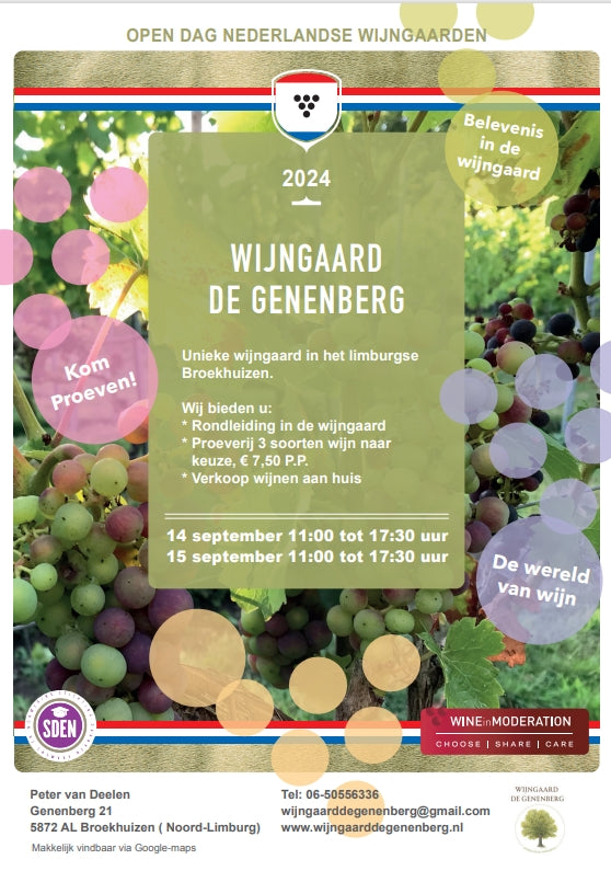 Op 7 september staat onze Wijngaard De Genenberg op het eerste Horster Wijnfestijn bij Graaf ter Horst. Verder zijn er nog andere wijnmakers en leveranciers uit binnen- en buitenland. Tickets verkrijgbaar via www graafterhorst.nl